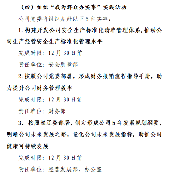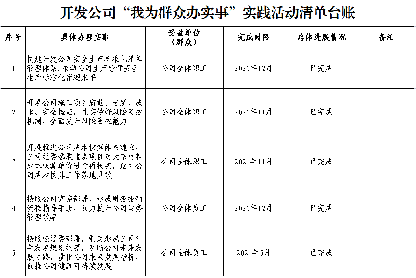 围绕聚焦企业经营发展、安全生产、施工项目、成本核算、财务管理等领域,确定5项办实事任务,建立办实事清单台账,实行动态管理、逐项销号,扎实推进“我为群众办实事”实践活动,切实把好事办好,把实事办实,让群众感受到党组织的温暖和关怀,让群众看到党史学习教育的成果,切实提升群众的获得感、幸福感和安全感。截至目前,开发公司5项办实事项目已全部完结。