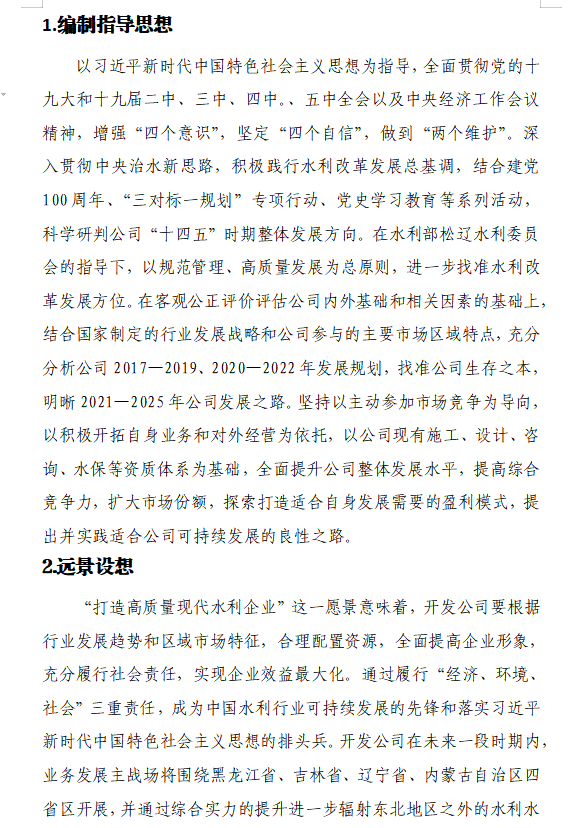 2021年,恰逢“十四五”开局、建党100周年,开发公司以规范管理、高质量发展为总原则,进一步找准水利改革发展方位,探索建立符合自身实际情况、符合业务发展要求、适应市场竞争需要的可持续发展之路。在客观公正评价评估公司内外基础和相关因素的基础上,结合国家制定的行业发展战略和公司参与的主要市场区域特点,充分分析公司2017~2019、2020~2022年发展规划,找准公司生存之本,在以往四期发展规划基础上,特制定《开发公司2021~2025年发展规划纲要》。《纲要》明晰2021~2025年公司发展的经营管理思路,分析公司发展的有利因素及存在的主要问题,提出适合公司持续发展的保障措施,为公司健康可持续发展提供了重要依据。