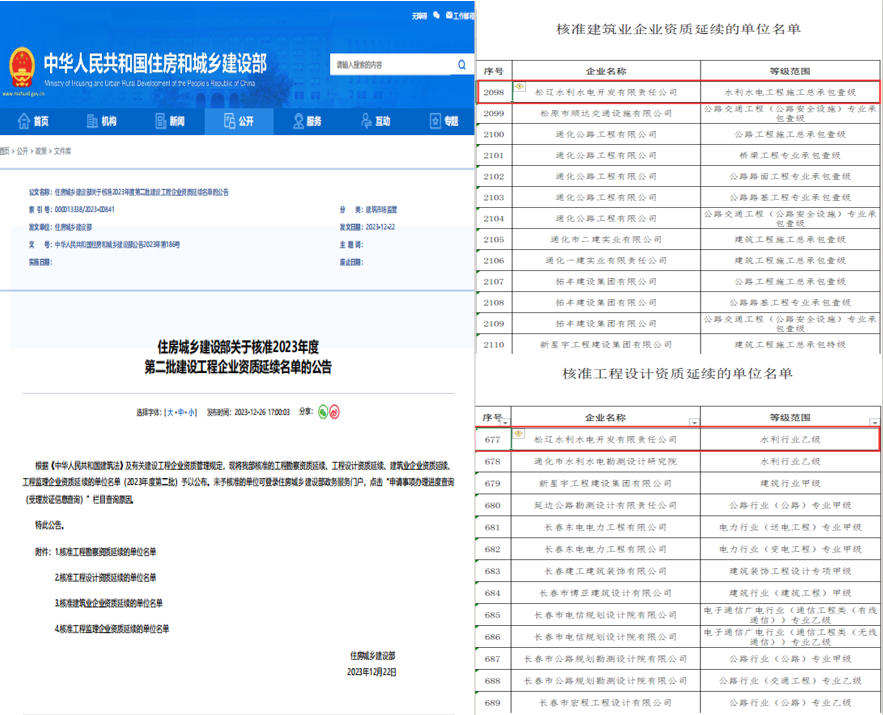 近日,经中华人民共和国住房和城乡建设部核准,PA捕鱼申报延续的水利水电工程施工总承包一级资质、水利行业设计乙级资质成功获批!