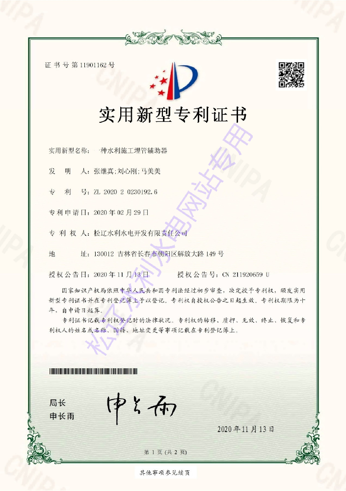 2020年11月取得“一种水利施工埋管辅助器”实用新型专利证书